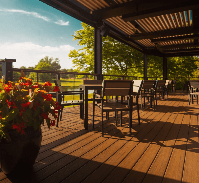 The private deck provides an elevated outdoor area overlooking the golf course — ideal for cocktail hour, small receptions, or mingling between ceremony and dinner.